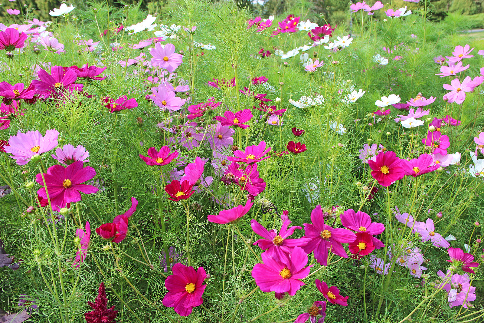 Cosmos (Cosmos bipinnatus). Blooms spring through summer in orange or yellow; hybrids come in white, scarlet, copper, or pinkish-red. Grows 8 to 12 inches tall and wide. Grow massed for the best display of color. Complements bird of paradise, shore juniper, and silverberry.