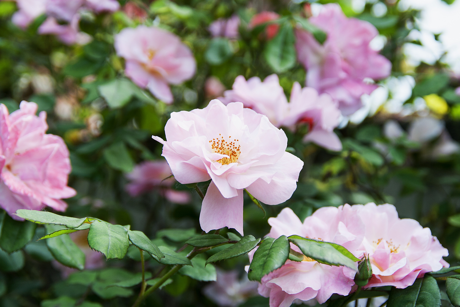 Roses: Complete all pruning tasks as soon as possible. Remove suckers. If late frosts have caused damage to new shoots, prune them back to an undamaged bud. Deadhead faded flowers; cut back to the nearest five-part leaf. Remove side buds to encourage large single blossoms or remove terminal buds to encourage clusters of blossoms. Disbud roses and other flowers for larger blooms. Plant container-grown roses. Install or repair supports for climbing roses. Tie new shoots of rambler and climbing roses to bamboo canes or wires; they will replace flowered stems in the autumn. Top-dress roses with compost. Mulch around roses with aged compost to keep down weeds and help them to retain moisture that will help them to resist attack from mildew during the summer. Avoid hoeing when weeds start to appear; control weeds by hand – rose roots are shallow and are damaged easily. Water newly planted roses thoroughly during dry weather. Water weekly if the weather is dry. Apply granular organic fertilizer after pruning. Fertilize roses when they start to grow; repeat monthly if using water-soluble fertilizer. Watch for pests and disease symptoms. Begin spraying regularly with a fungicide. Spray for aphids.