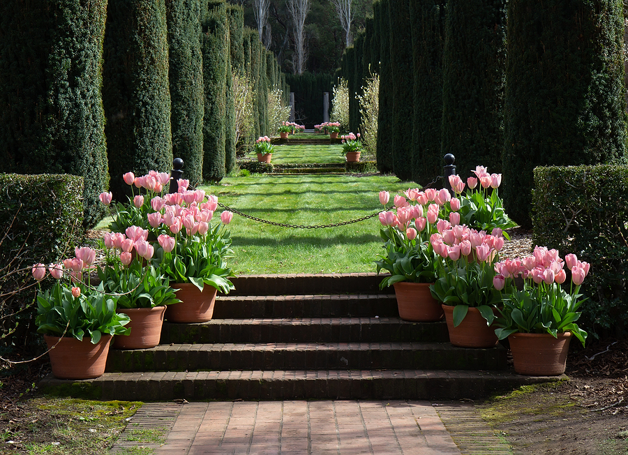 - Formal gardens commonly have tightly clipped hedges and uniformly planted flower beds. Formal gardens often have geometrical plant color patterns, usually annuals planted in patterns, or plant themes such as a rose garden