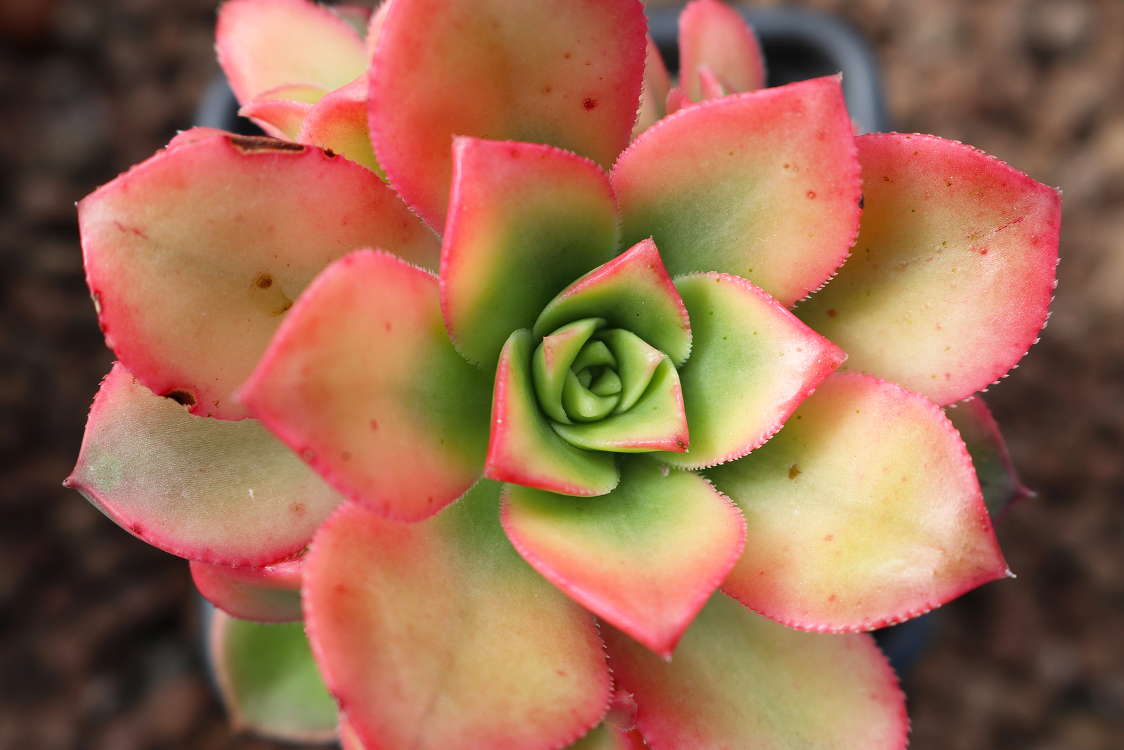 - Shape and size: Rosette-forming; some form a clustering base; some sit atop a sturdy stem leaves can be green, pink, red-black or with a yellow variegation;