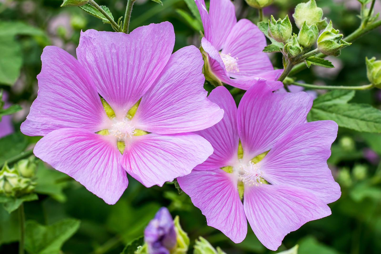 - Flowers: Bowl-shaped pinkish or purple-pink hollyhock-like flowers are borne throughout mild weather, year-round in mildest climates.