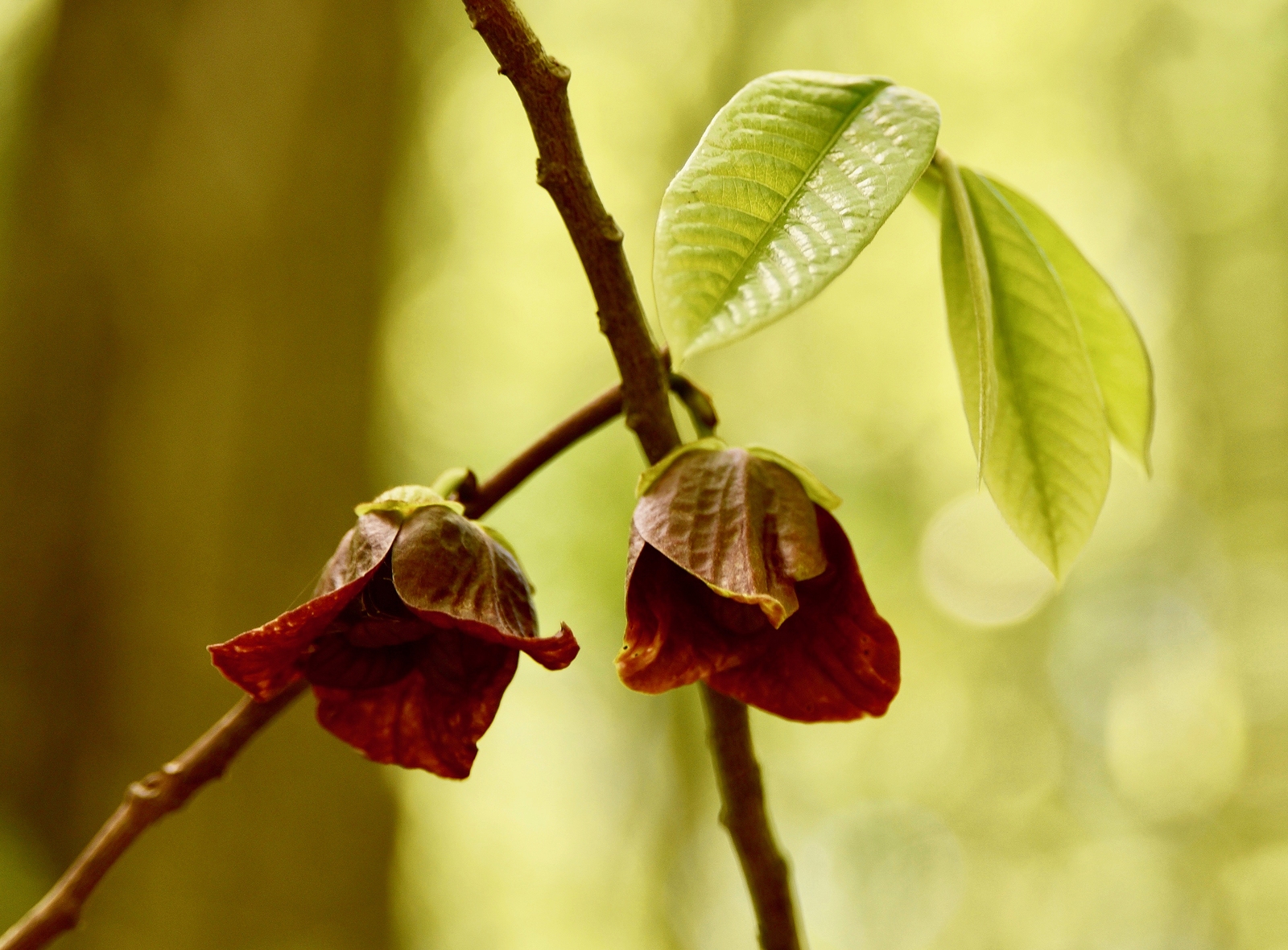 - Asimina triloba, Pawpaw, deciduous shrub or small tree with obovate, mid-green leaves, to 12 inches (30cm) long, turning yellow to coppery red in autumn. Cup-shaped flowers, 1.25-2 inches (3-5cm) across, each with 3 large calyx lobes surrounding 6 purple-brown petals (3 large and 3 small), are borne singly or in small clusters in late spring. Ovoid to bottle-shaped, edible, sweet fruit, to 5 inches (13cm) long, are yellow-green, ripening to yellow-brown. To 20 feet (6m) tall and wide. Eastern United States.
