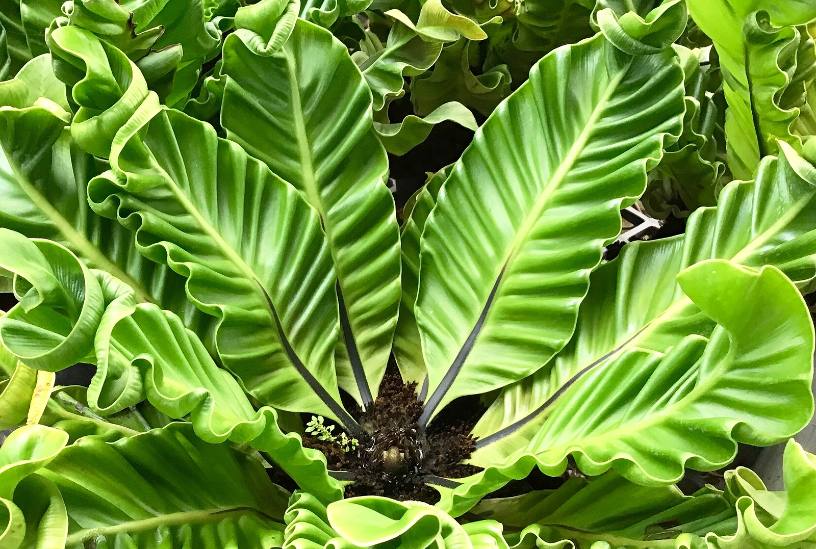 - A. nidus, bird’s nest fern. Bowl-shaped rosette of shiny, simple fronds with a brown, hairlike center resembling a bird’s nest; broad, leathery, apple green, wavy-edged fronds are from 1 to 2 feet in length.