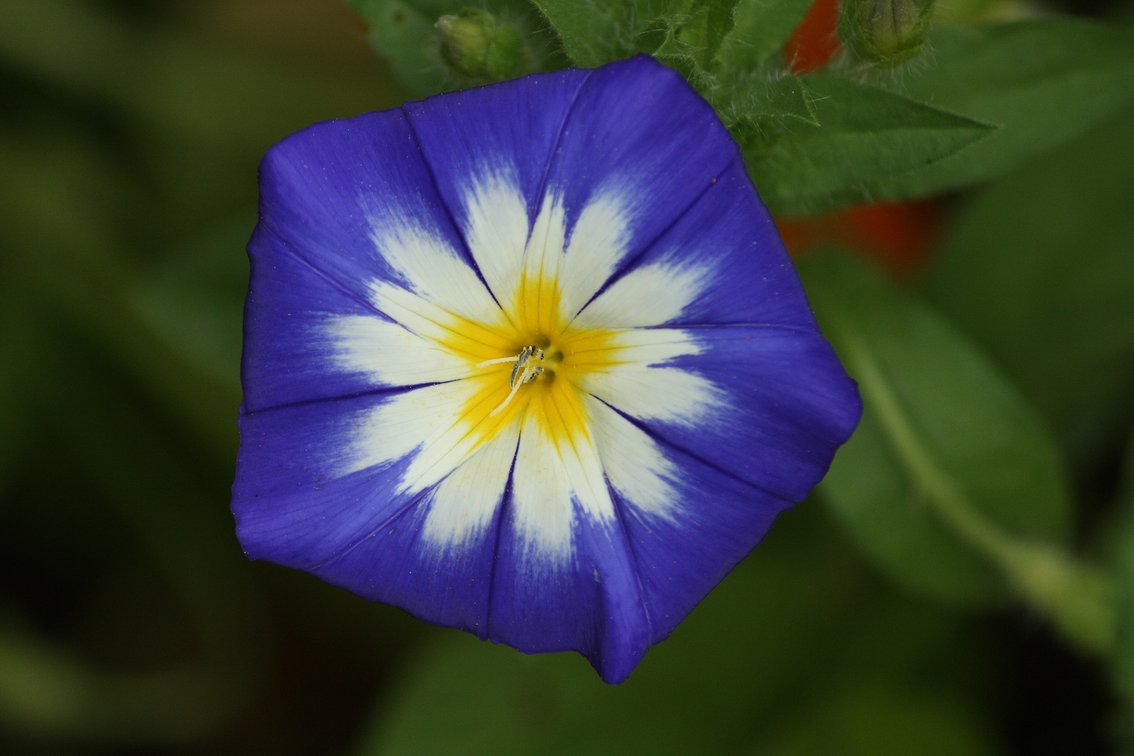 - C. tricolor. Dwarf morning glory. Annual or short-lived perennial. Grows 1-to 1 ½-foot-tall with ovate to lance-shaped leaves; solitary trumpet-shaped flowers, 1 ½-inch-wide are rich blue with yellow-and-white throats; blooms in summer; blooms last only a day and close in cloudy weather. ‘Blue Flash’ and ‘Rainbow Flash’ are strains of mixed colors that grow to just 6 inches tall.