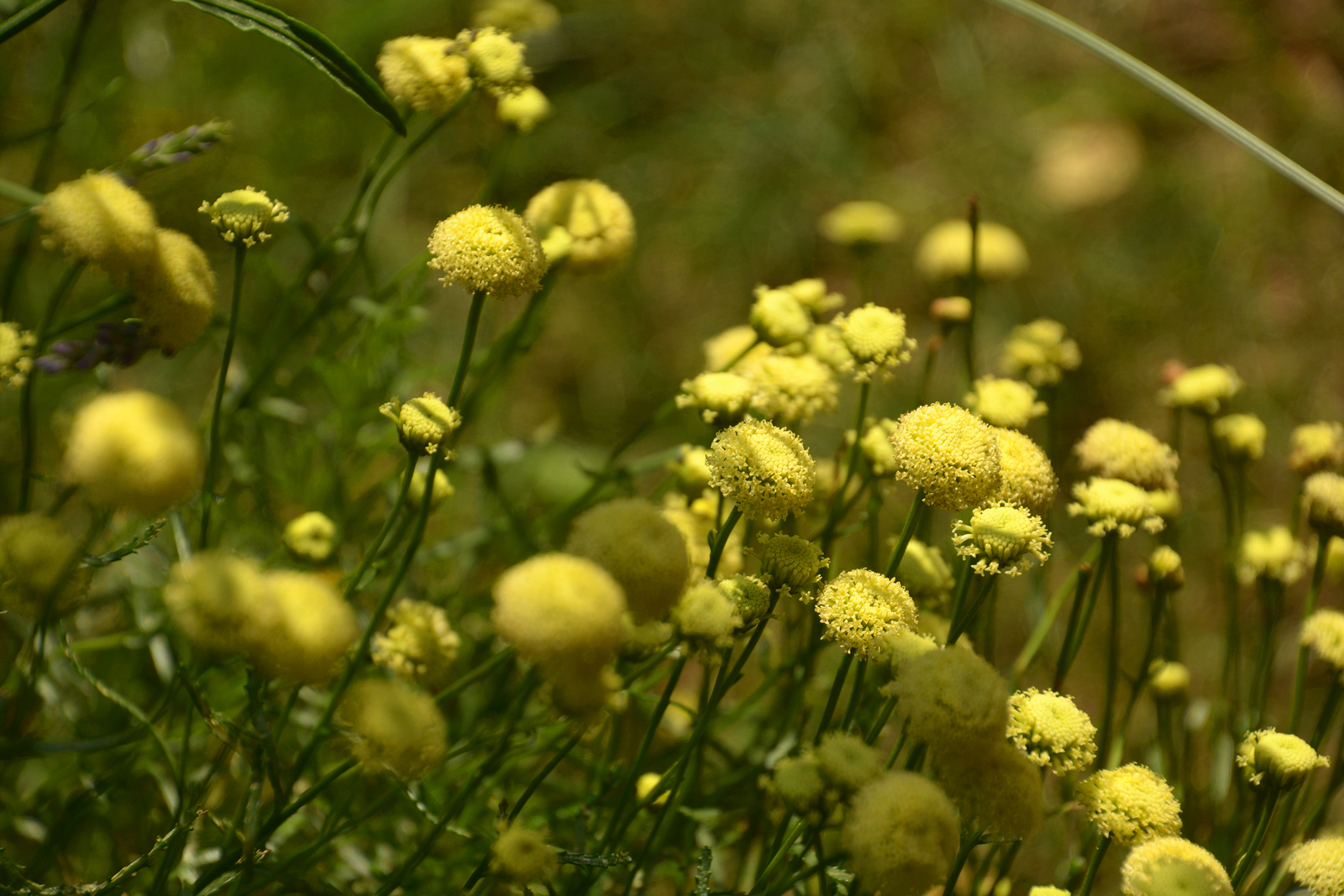 Santolina–commonly called cotton lavender–bears yellow pompom summer blooms that last weeks. Santolina is an evergreen perennial, sometimes grown as an annual. The plant has aromatic foliage that can be dried for potpourri.