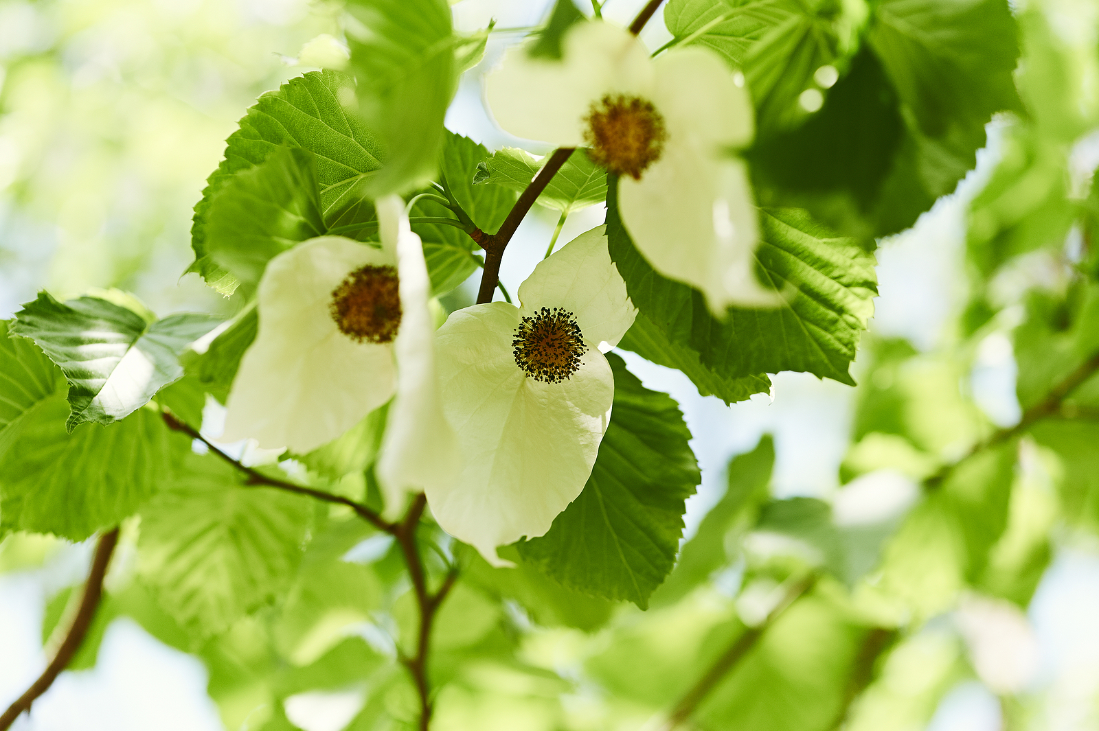 Davidia is a medium to large tree with a domed crown. Davidia bears pale white bracts in spring that look like fluttering handkerchiefs or nesting doves—thus Davidia’s two common names dove tree and handkerchief tree.