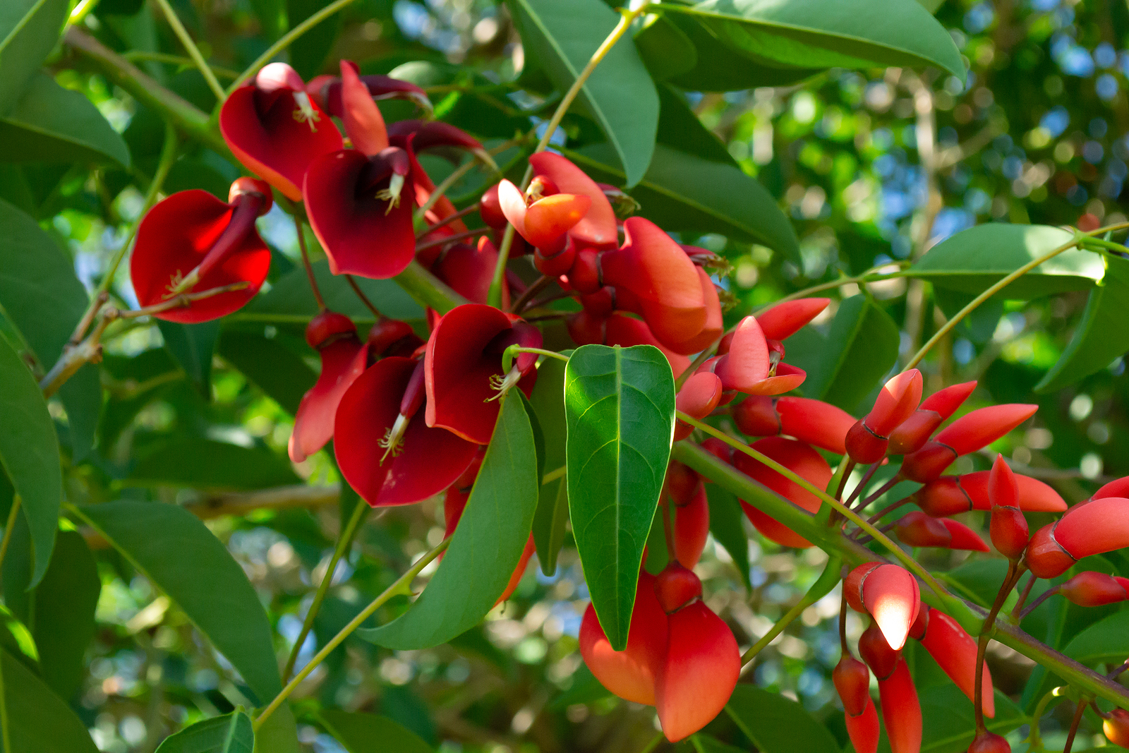 Erythrina — commonly called Coral Tree–is grown for its brilliant flowers in colors ranging from greenish white through yellow, light orange, and light red to orange and red. Flowers are borne singly or in clusters in the leaf axial or on terminal racemes
