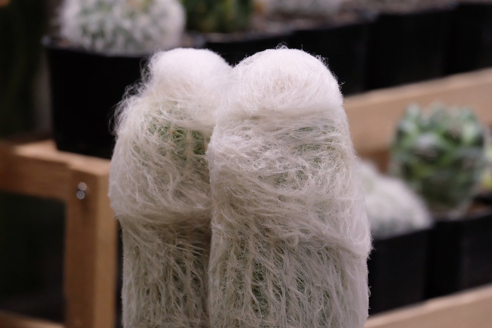 - Espostoa lanata (cotton ball, Peruvian snowball, Peruvian old man). Attractive, yellow-spined cactus is completely covered with fluffy, white, almost silky hair. Wool appears to grow in spiral manner. A fine potted plant for indoors, lath house, or greenhouses. Usually grown for its interesting appearance rather than profusion of blooms; flowers appear only on mature plants and are often hidden by hair.