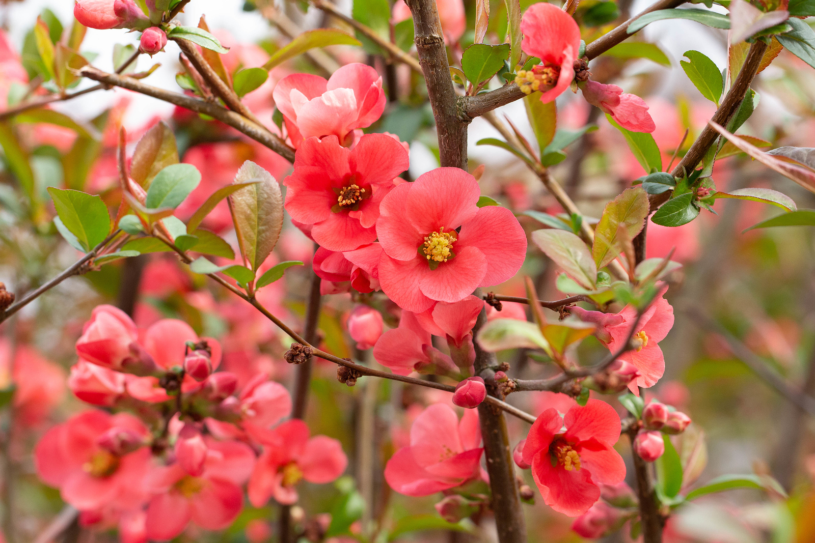 The flowering quince, Chaenomeles, is a spreading deciduous shrub that bears clusters of showy flowers in late winter before leaves appear. Blossoms are cup-shaped with 5 petals and up to 60 stamens. Single or double flowers can be solitary or clustered.