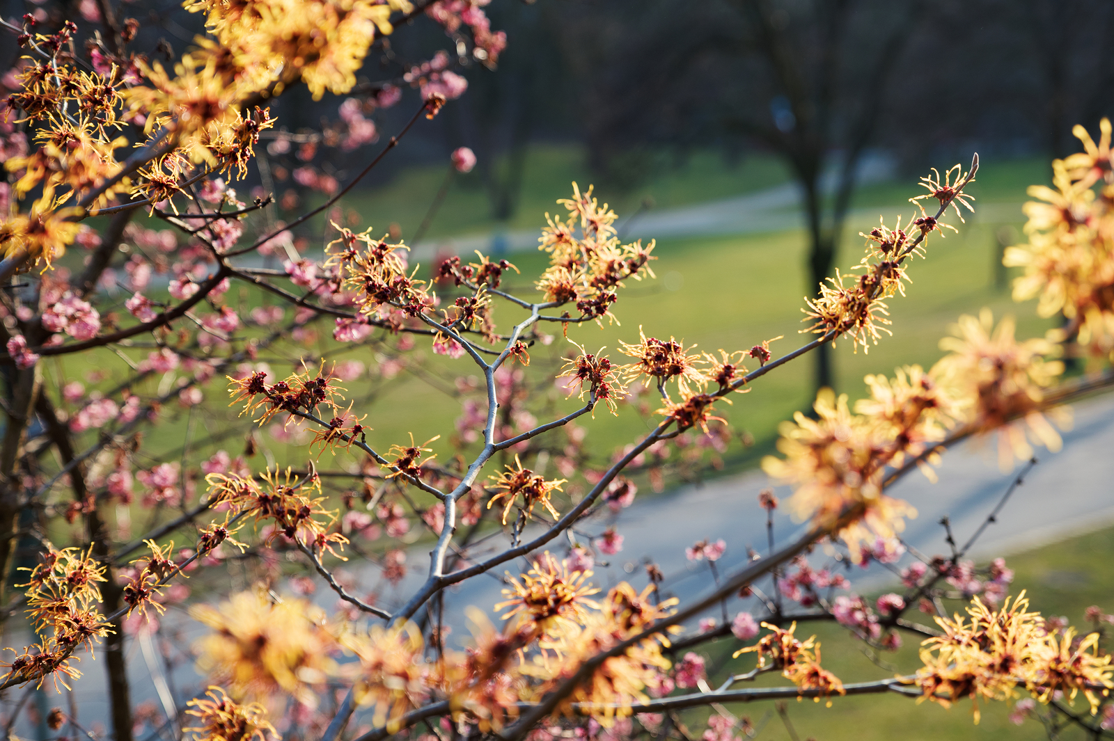 Hamamelis–commonly called Witch hazel–is a deciduous shrub or tree commonly grown for its autumn color, cold-resistant, fragrant, spider-shaped flowers. The yellow flowers have strap-shaped petals.
