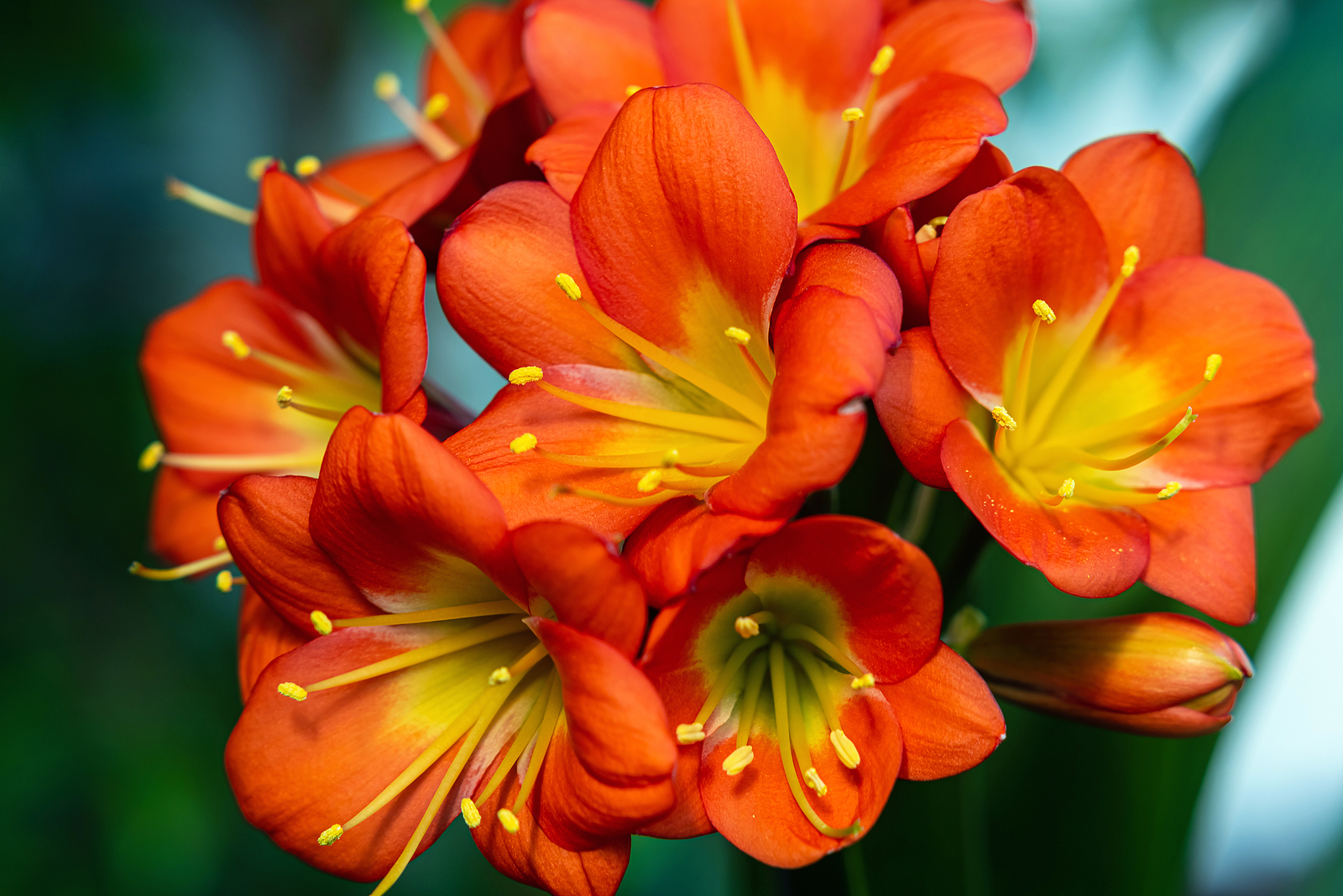 Clivia–commonly called kaffir-lily–bears clusters of brilliant, trumpet-shaped blooms alongside glossy deep green, strappy leaves. Clivia is a showy member of the amaryllis family.