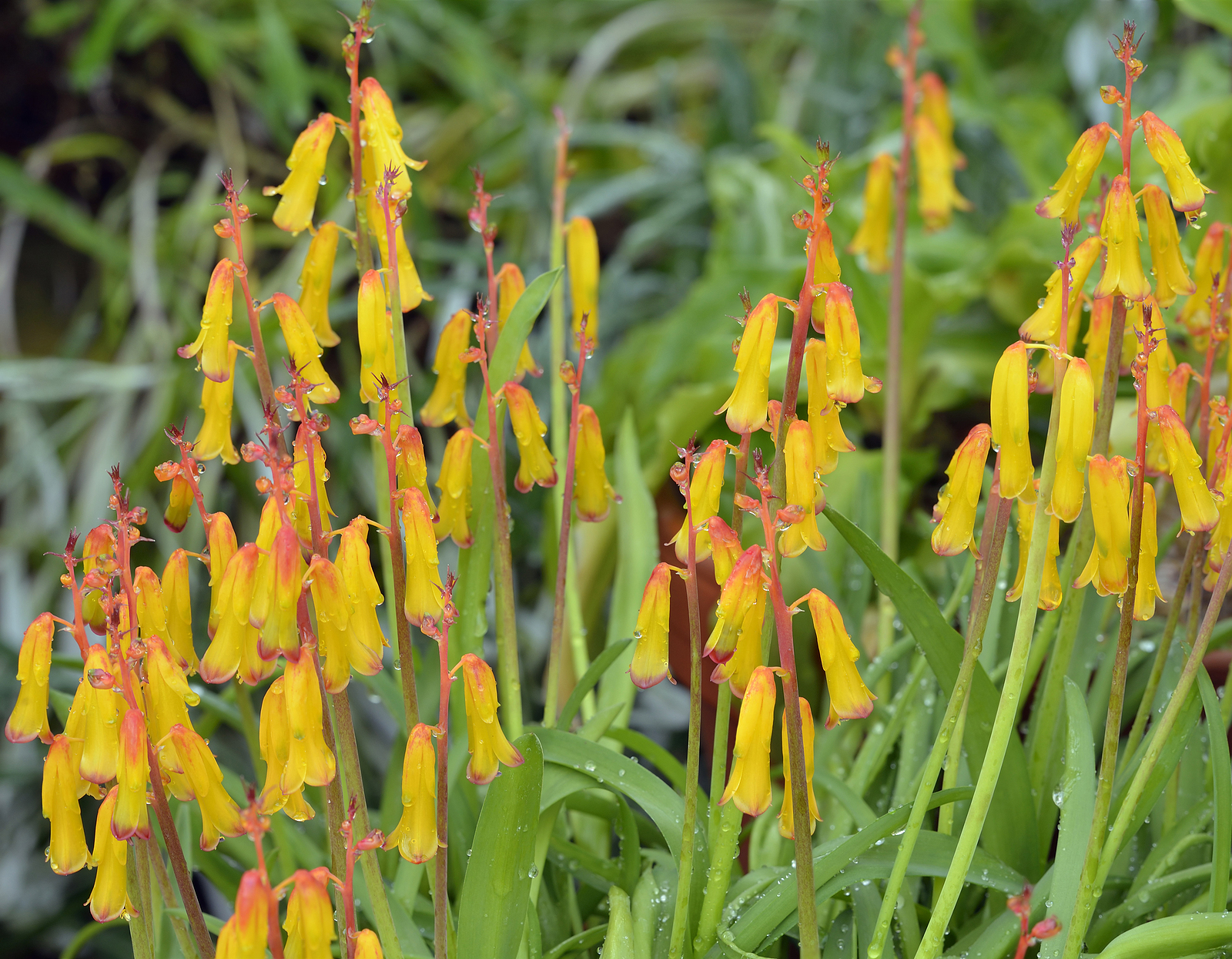 Lachenalia–commonly called cape cowslip–is a tender bulbous perennial that bears showy, erect spikes or racemes of bell-shaped or tubular yellow or orange flowers. The flowers appear from autumn until spring; the plant is dormant in summer.