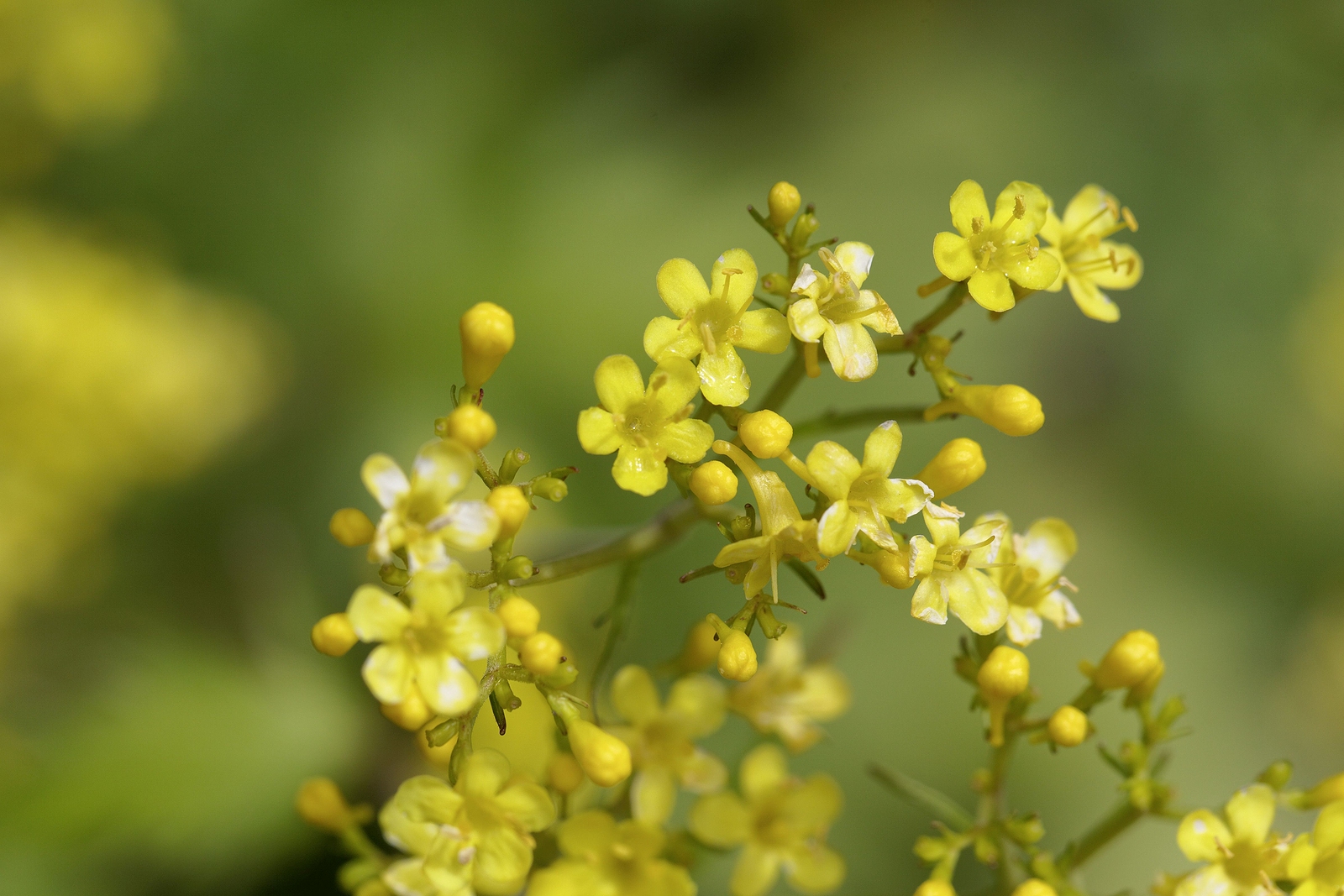 - Flowers: Long-stemmed, sometimes corymb-like panicles of small, 5-lobed, cup-shaped, yellow or white flowers