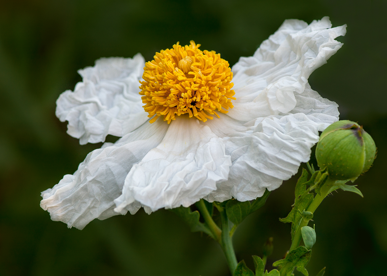 Romneya–commonly called Matilija poppy–is a large perennial shrub with many basal stems and large, white, crepe-like petaled flowers that can reach 9 inches across. Romneya grows 5 to 8 feet tall; both the stems and foliage are bluish gray-green.