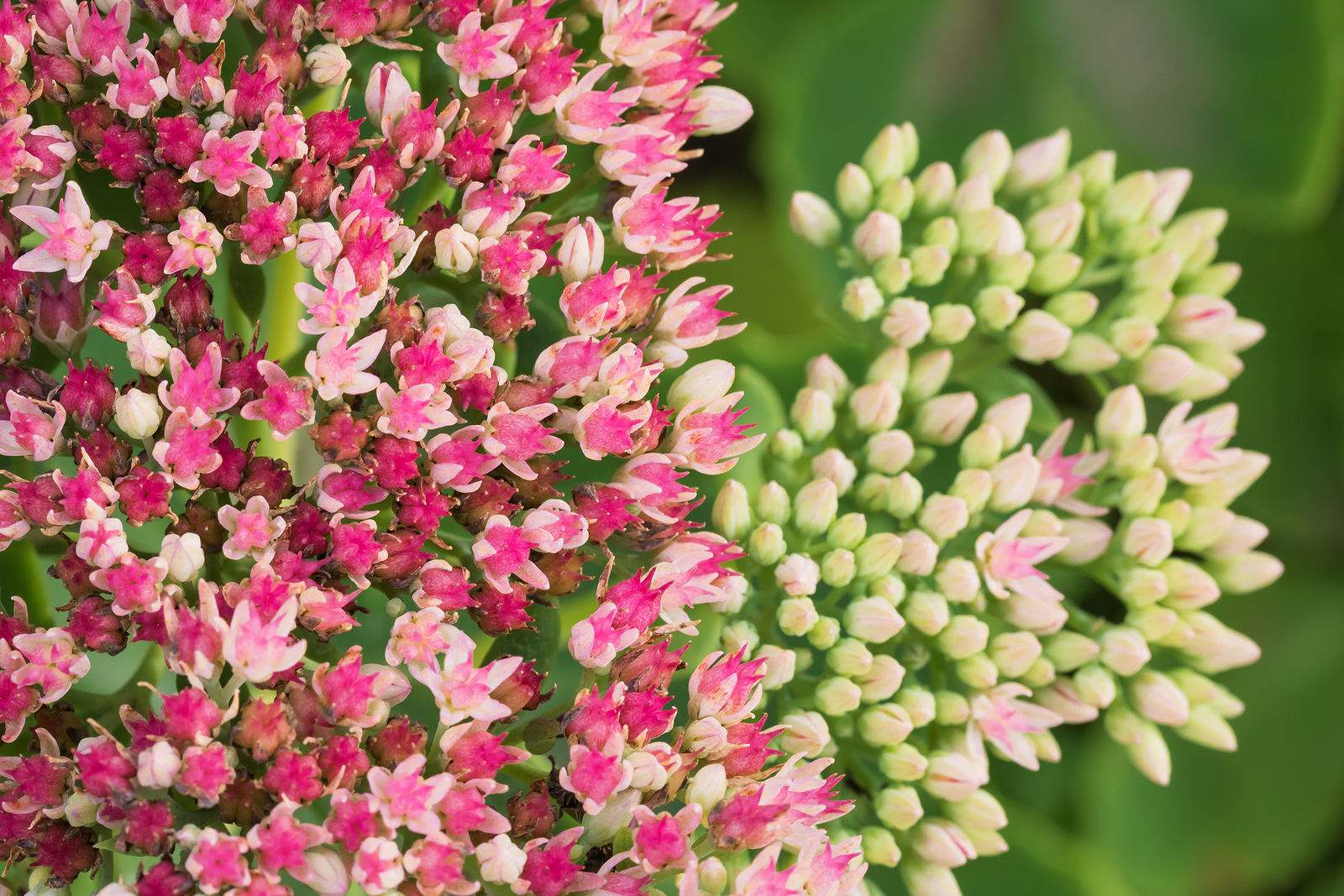 Stonecrop, Sedum spectabile and Sedum maximum atropurpureum, are fleshy-leafed, succulent plants. They bear tiny, star-shaped flowers grouped together into flat-topped clusters. Leaves are oval, rubbery textured, usually with a blunt end/
