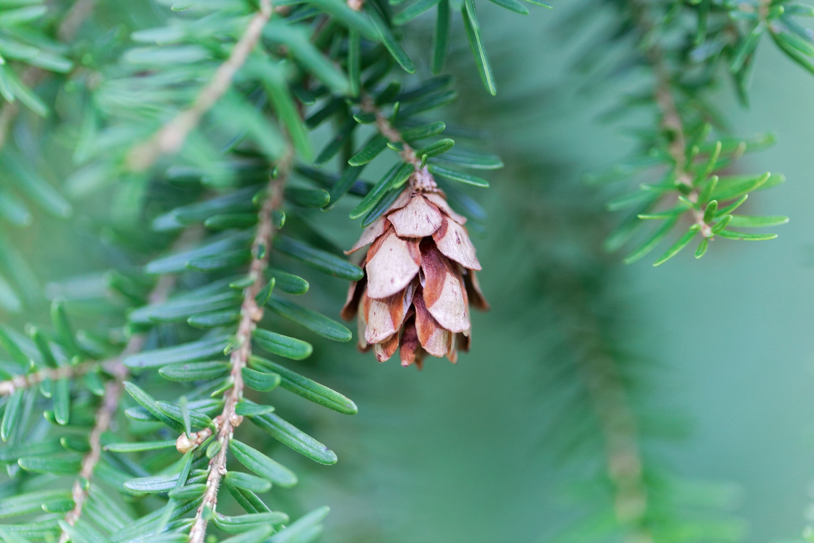 Tsuga have short, flat, fine-textured needles. They have two white bands on their undersides. Cones ripen in autumn and resemble miniature pine cones. The bark is deeply furrowed, cinnamon-colored to brown.