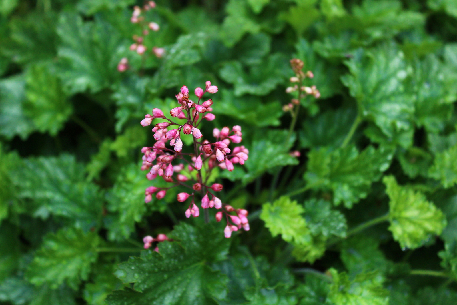 - x Heucherella alba: ‘Bridget Bloom’ flowers are shell pink; bright green leaves from a basal clump; ‘Rosalie’ has deep pink flowers.