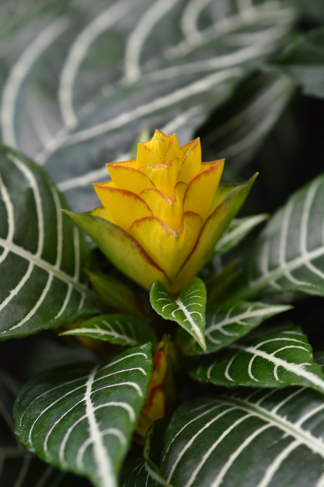 Aphelandra–commonly called Zebra plant–is a dramatic plant with bright, almost silvery, striped foliage against dark green leaves. Yellow flowers come in late summer and fall.
